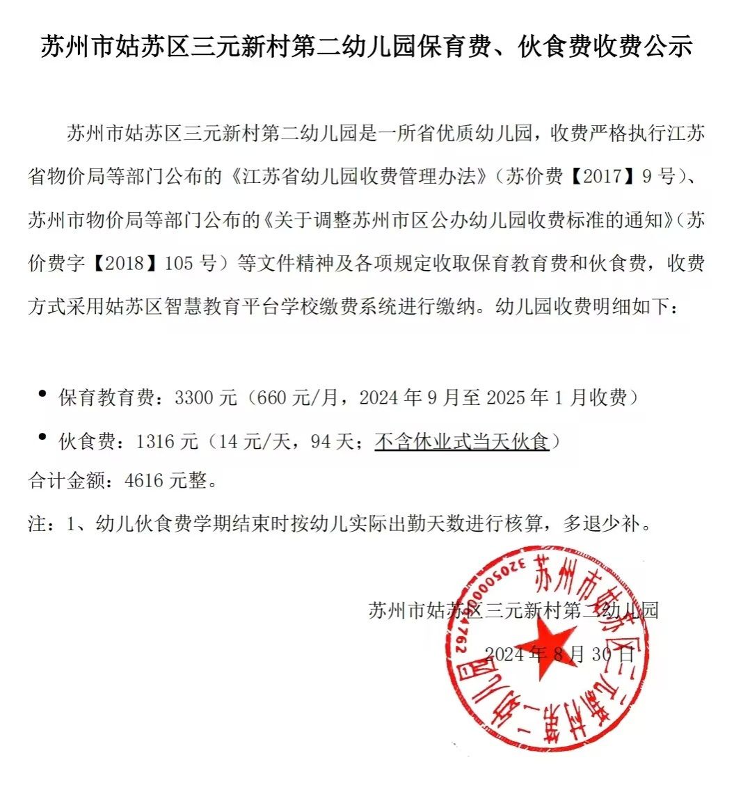 苏州市姑苏区三元新村第二幼儿园保育费、伙食费收费公示