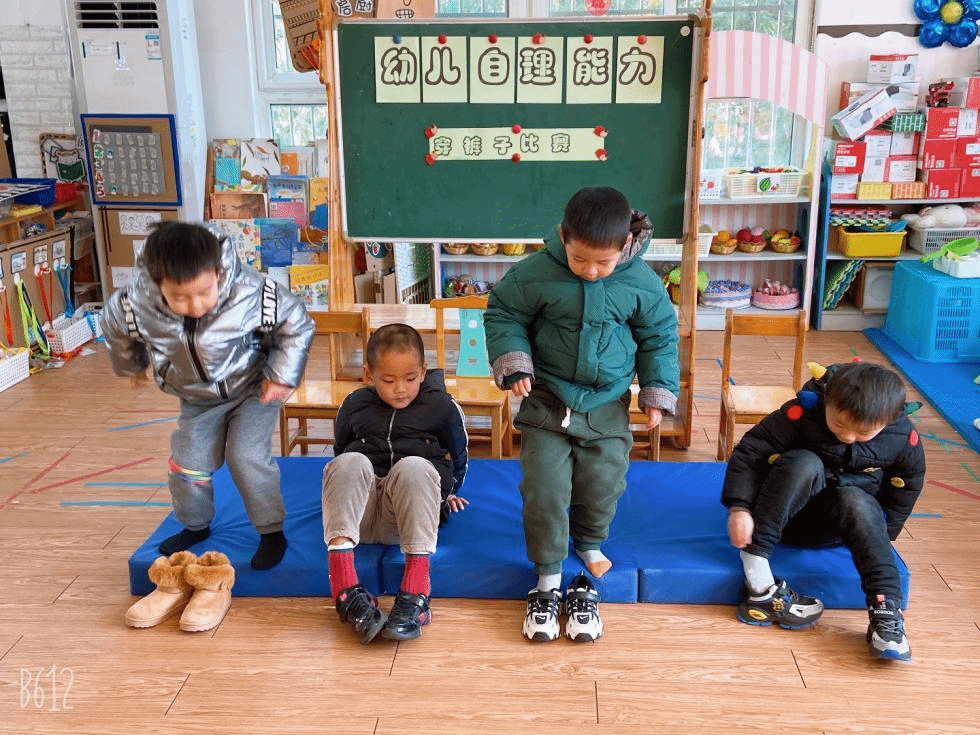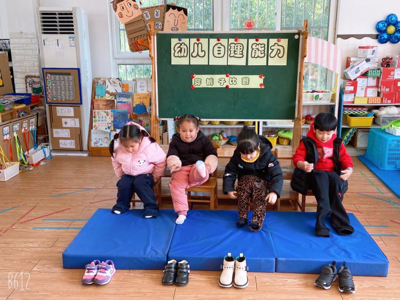 瞧,小选手们多可爱呀,他们先把自己的长裤脱下,放在垫子上,等待老师的口令。随着老师的一声令下,“预备——开始!”小选手们都十分投入到活动中,有的孩子穿裤子动作迅速利落,拎起裤腰,一只脚伸进去再伸另一只脚,也有的两只脚一起伸进去。整个教室里 “加油!加油!”声此起彼伏。在老师和小伙伴们的呐喊声中,每个小选手都特别努力,有的小选手虽然落在了最后,但仍然执着地做着没完成的动作,那股较真劲,让大家感动不已。