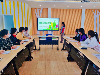 在培训过程中,专项培训人员阐述了垃圾分类的重要性。对什么是垃圾、垃圾是如何产生的、生活中的垃圾、以及垃圾如何分类和垃圾分类的好处进行了讲解。期间,培训人员结合日常生活场景,组织大家进行知识问答,还利用小组形式交流分享垃圾分类的好方法。全体教职工踊跃发言,积极思考,活动进行得如火如荼。