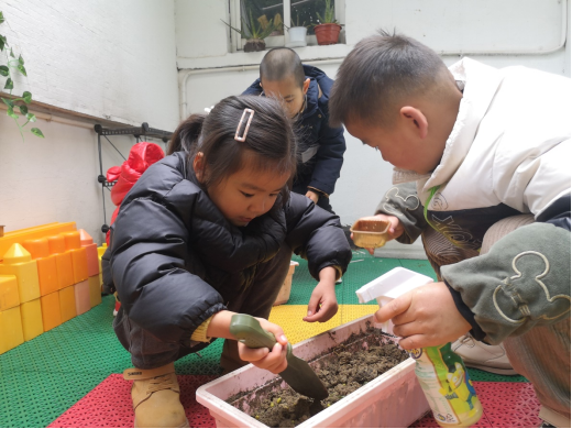小朋友们选了自己想种的豆豆,和小伙伴一起开始种豆豆啦!看,孩子们一个个忙得不亦乐乎。拿着小铲子将泥土填进花盆,按照老师介绍的步骤,先装上一半的泥,浇上一点水,再拿起小种子,轻轻一按,放入土中。最后再装满泥土掩埋种子,很快孩子们快乐的完成了豆豆的种植。虽然宝贝们装泥土、放小种子、填土的动作还很稚嫩,但他们从中积累了种植的经验。孩子们看着自己亲手种下的豆豆,并一起回想了一遍种豆豆的过程——填泥土、浇水、放种子、封土,简单的过程在孩子们的眼中是神圣的,孩子们期待着小种子长大的样子。