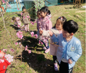 幼儿们来到户外,寻找桃花,一起捡着桃花、赏着桃花,感受桃花的美。盛开的花朵让幼儿们在观赏的同时情不自禁地想用手去触摸它们,一张张笑脸也跟花儿一样灿烂美丽。长在角落里不显眼的小野花也在寻找过程中被发现了,幼儿们一个个蹲下身来,围着小野花,沉浸在发现春天的小秘密的世界里,闻着花香,数着花瓣,玩得特别开心。