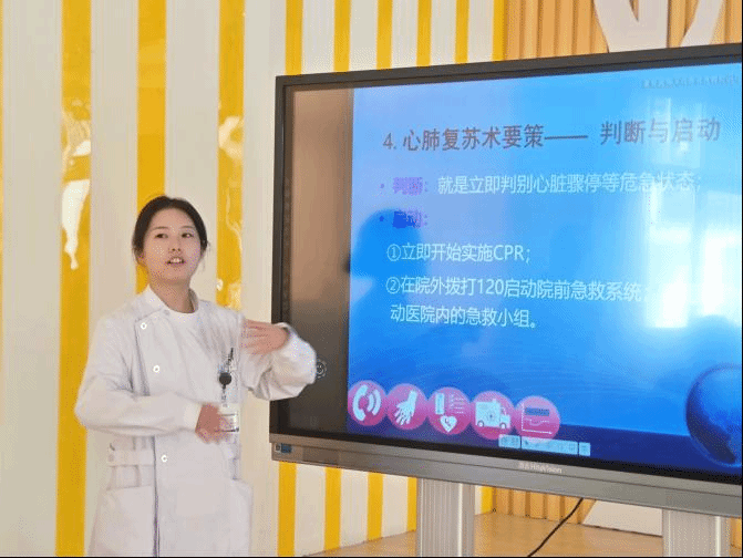 培训中郑护士详细讲解了心肺复苏术的目的以及心脏骤停的诊断与注意事项,并现场演示了心肺复苏急救措施和实操要点。为了让老师们更直观地理解急救措施,郑护士以心肺复苏作为重点,现场演示了心肺复苏的操作流程和技术要领,老师们也跟随郑护士的动作指导要领进行模拟训练和现场互动。经过亲身体验老师们对现场急救知识有了新的认识和深入的理解,懂得在意外来临时如何正确面对。