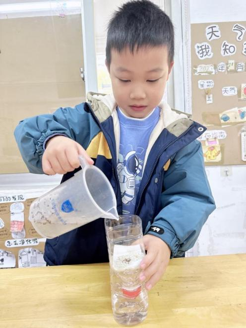 活动中,教师和幼儿们一起利用绘本、多媒体等途径,了解了净水的相关知识,丰富对过滤的认知经验。大家发现原来利用各种各样的材料把脏水里的东西过滤掉,水就能变干净啦!幼儿们按照自己的想法画出了设计图,找来了想要尝试的材料,开始了他们的实验。第一次实验的结果不尽人意,出现了各种各样的问题。做出来的污水净化器的水流不下来、净化过的水不是很干净、还有小黑点......于是幼儿们展开了激烈的讨论,一轮头脑风暴后,开始了新的实验,调整过滤材料的顺序,经过一次又一次的探究,幼儿们知道了首先使用稍粗的沙子石子过滤,这样可以过滤掉污水中的残渣。纱布过滤后,进入活性炭过滤阶段,活性炭可以将水中的杂质吸附干净。最后进入棉花过滤,实现小颗粒物质的过滤。有了这样一个净化器,就能把脏水重新变得清澈透明起来。