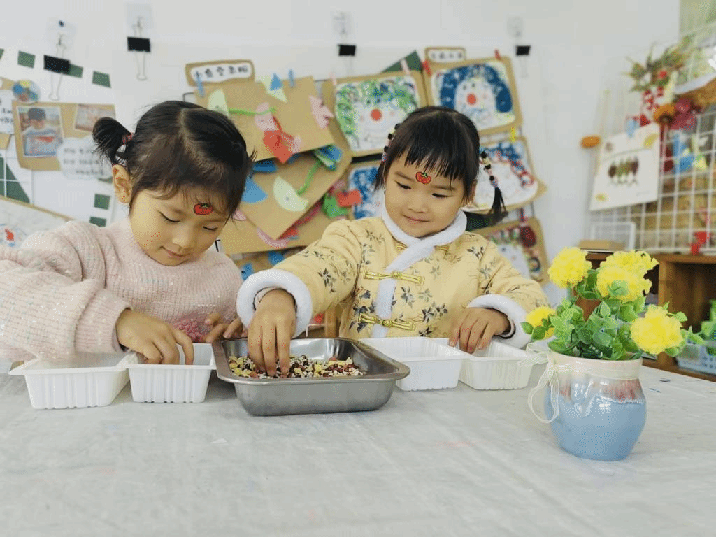 小班的老师通过多种形式,向幼儿们讲述了腊八的由来和习俗,让幼儿们了解更多关于腊八的秘密。还一起挑选了腊八粥的食材,等待厨房的叔叔阿姨把这些食材变成美味的腊八粥呢!中班的幼儿们用了家里常见的大蒜、香醋、盐、糖等调味品制作腊八蒜。瞧!幼儿们把大蒜的皮剥掉,轻轻地放在密封罐中,再加入所需要的调味料,密封起来腌制几天,美味的腊八蒜就制作好了。幼儿们抱着自己制作的腊八蒜,心里美滋滋的。在这个百花凋零的季节,唯有梅花还生机勃勃,大班的幼儿们首先通过观察腊梅花的形态特征,然后进行创意粘土粘贴画。看!幼儿们用自己灵巧的双手动手制作了美丽的腊梅花,并把腊梅花装饰在了树枝上,可真漂亮呀!