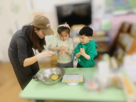 美味可口的饼干是如何制作的呢?需要哪些材料?助教妈妈和幼儿们一起准备好了所需的材料,并通过视频的方式一起学习了制作方法。首先将面粉和水进行融合,经过揉搓和成面团,然后取出一块揉成一个小球。接着再用小手用力按压,饼干模型就完成啦!大家一起把完成的饼干模型送到烤盘上,等待烘焙。不一会,香喷喷的饼干烤好了!品尝着自己动手制作的饼干显得格外的香甜,幼儿们脸上写满了幸福。