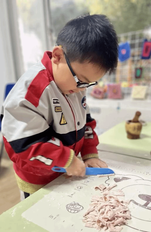 活动前,老师向大家介绍了制作彩色面条需要用到的食材和工具。同时引导幼儿们通过看、摸、闻等方式对面粉进行观察。活动中,幼儿们分工合作,一部分幼儿们先将蔬菜清洗干净后开始切菜,另外一部分幼儿进行榨汁,揉面和搅拌工作。所有准备完毕后,大家通过揉、压、擀等技能将面团擀成了薄片,然后切成面条。最后大家纷纷说道:“我们成功啦!”