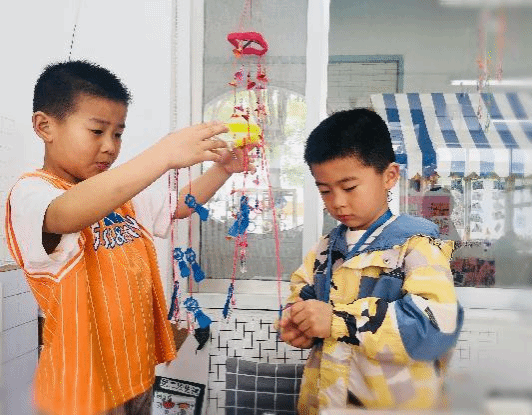 活动前,幼儿和家长们借助网络、书籍等资源查阅资料,对风铃的种类和制作材料展开了调查。随后老师和幼儿们结合调查表,通过幼幼互动、师幼互动等多种形式进行分享交流,大家发现风铃由主线、铃托、吊线、铃铛四部分组成。活动中,幼儿们大胆尝试用各种开放性材料制作风铃,针对制作过程中出现的问题,幼儿们分工配合,积极寻找原因。“风铃为什么没有发出声音?”“吊线容易打结怎么办?”……带着这些问题,幼儿们主动地观察、比较、调整挂线长度、寻找平衡点等……经过一次次地测试实验,不断进行改进调整。最终,一串串别具特色的风铃在幼儿们的手中诞生。