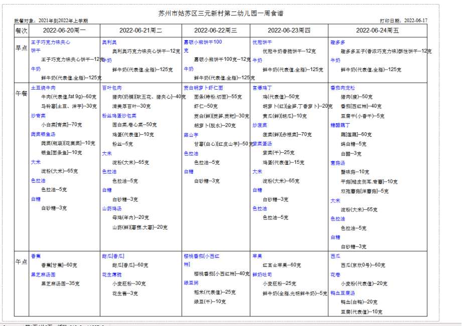 三元新村第二幼儿园幼儿食谱 第五周(2022.6.20—6.24)