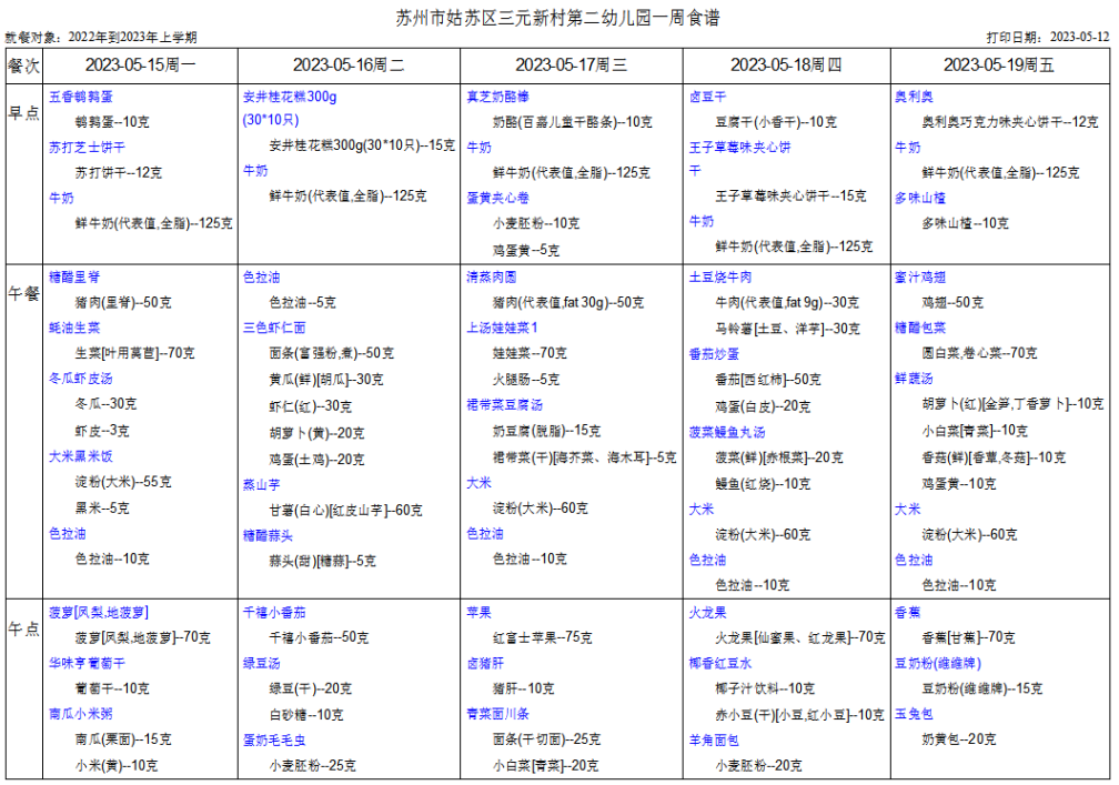 幼儿食谱第十五周(5.15——5.19)