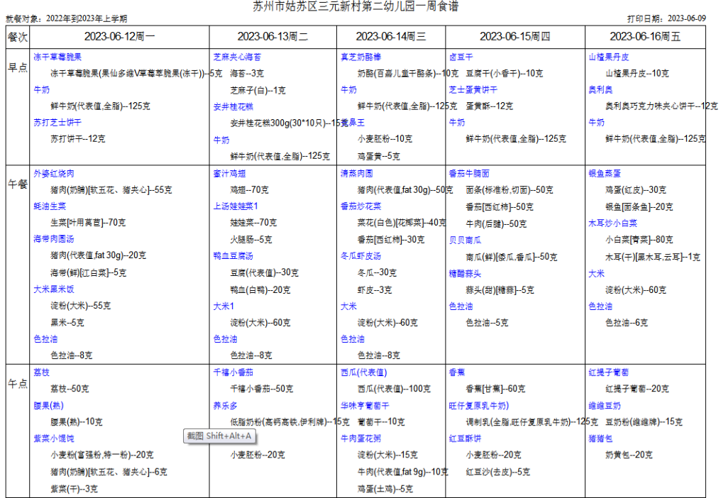 第十九周幼儿食谱(6.12—6.16)