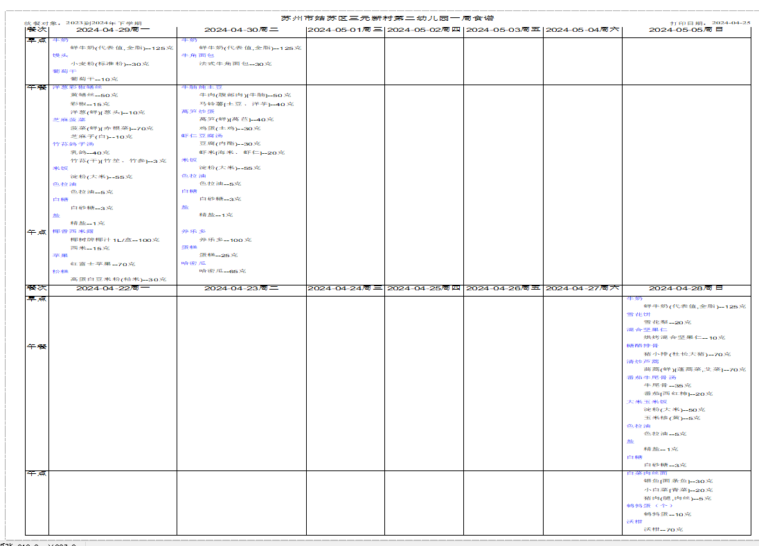 幼儿食谱第十一周(4.28—4.30)
