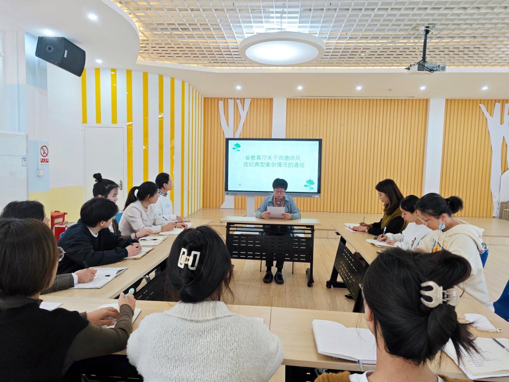 本次活动老师们共同学习了《习近平总书记关于师德师风的重要论述》以及《新时代幼儿教师职业行为十项准则》,了解了省教育厅关于师德师风违纪典型案例情况的通报,相信通过学习,老师们都会勉励自己,成为一名有温度的老师。