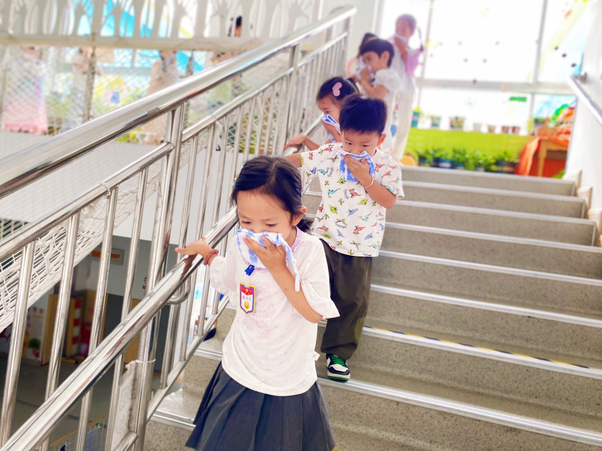 上午10时,听到警报后,各班老师立即停止教学活动,迅速指导孩子们用湿毛巾(或小手帕)捂住口鼻,弯腰低头,沿着教室两侧的安全通道快速移动。过程中,老师不断提醒孩子们 “不要推挤”“跟着队伍走”,并重点关注行动较慢的幼儿,全程守护在队伍两侧。当所有幼儿安全撤离至操场指定区域后,各班老师迅速清点人数并向演练总指挥汇报。