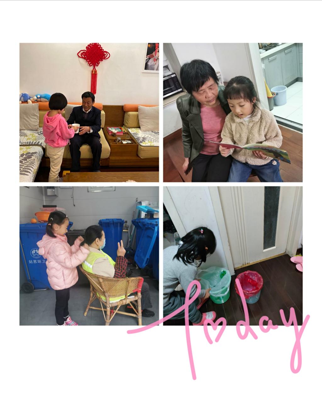 “尊老、爱老、敬老、护老”是中华民族的传统美德。在日常生活中,孩子们享受着老人们无限的关爱和呵护,为了感谢老人们的默默付出。在这个礼仪之春,苏州市姑苏区三元新村第二幼儿园大三班的孩子们努力争做文明小公民,用自己的实际行动表达对爷爷奶奶的感谢。有的孩子为爷爷奶奶捶背,捏肩;有的孩子主动为爷爷递茶水;有的孩子将学到的故事讲给奶奶听;有的孩子将垃圾分类的知识与老人分享。孩子们还主动向爷爷奶奶学本领,学习做家务:择菜、扫地、拖地、淘米、包饺子。通过这些力所能及的小事,孩子们用自己的行动,表达了对祖辈的感恩之心和深深谢意!