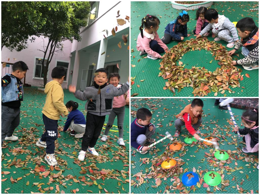 春风中,落叶在飞舞,孩子们兴奋地来到大树下。他们有的把树叶聚成一堆,天女散花一般洒向天空;有的借助游戏器具玩起了打地鼠的游戏;有的收集大小不同的树叶,玩起了树叶拼图……