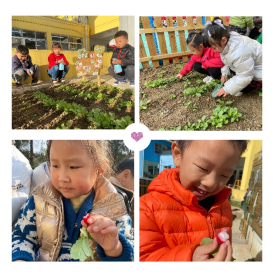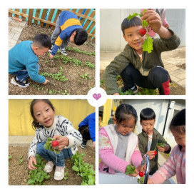 在整个过程中,孩子们自己动手种萝卜、照顾萝卜、拔萝卜、洗萝卜、品尝樱桃萝卜,亲身体验着种植带来的欢乐。自然是个神奇的魔法师,无论多么平凡的生命,都能孕育出无穷尽的奥妙。大四班的孩子们虽然已在种植园里收获了快乐、体验了成功、享受了美食带来的满足,但孩子们与种植园的故事仍在继续,让我们一起期待孩子们与种植园崭新的故事吧……