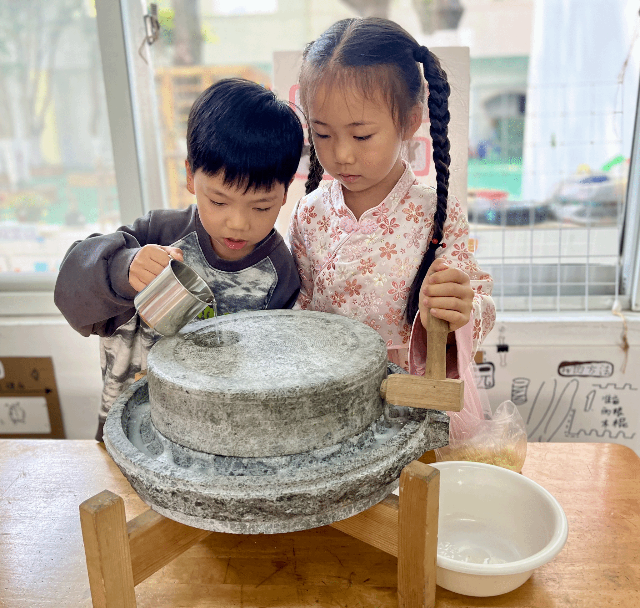 幼儿园教育以《指南》精神为引领,抓住生活中幼儿的兴趣点,挖掘生活化的活动素材。石磨坊区域开展过程中,孩子们学会了生活、懂得了珍惜劳动成果;学会了分工合作、学会了豆浆的制作过程,更体验了成功的快乐!