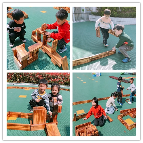 小二班的孩子们第一次尝试比较有挑战性的户外大型的搭建玩具。没有老师的指令,只有游戏的需求带来的互相协作。在与老师的共同努力下,很快房屋、阁楼、围墙就搭出来了,不满足于围墙的长度,几个孩子又自发的将围墙延长。