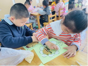 苏州市姑苏区三元新村第二幼儿园抓住教育契机,在10月18日大二班幼儿进行种子贴画。种子画,就是用各种植物种子粘贴制作出来的画。简单介绍种子画的制作方法准备材料:各种颜色的种子,卡纸、白胶、牙签。做法: 1.首先在卡纸上画出鱼、花、鸟等.简单图案; 2.然后选择色彩、大小合适的豆子,用双面胶粘在卡纸上的图案;处3.把种子黏上去,美丽的种子画就诞生了!制作过程。