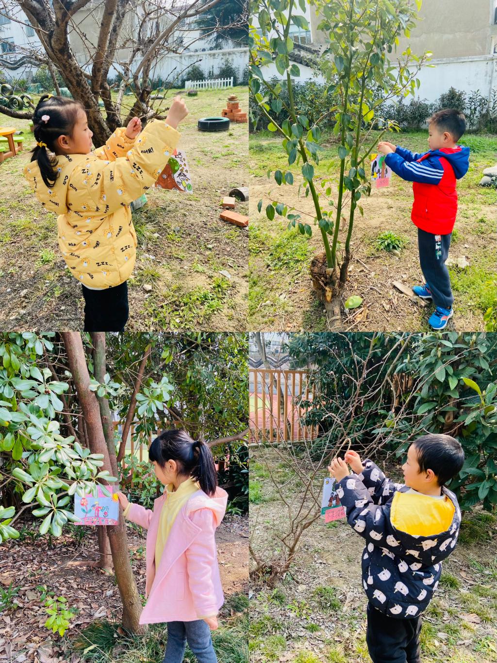 幼儿园的树可真多呀,蜜糖砂糖桔树上挂着结的果实,看起来可真美味呀;葡萄柚树上结满了果实,柚子的清香飘得远远的;桃树的树枝上抽出了嫩绿的新芽;香樟树下掉落着一颗颗黑珍珠一样的果实......一花一树都是大自然赐予我们宝贵的财富,需要我们一同爱护和珍惜,于是小朋友们商量制作了一个个提示牌,提醒大家,一定要爱护花草树木,保护我们的环境。