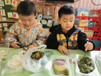 活动前,家长们兴致勃勃地为孩子们准备了饺子皮、饺子馅和一把小勺子。准备工作完成,在学习了简单的包饺子办法后,孩子们动起来了,拿出一片饺子皮,放一勺香香的馅料,抹一圈清水,再对折饺子皮,最后伸出食指按一按……这样,一个个饺子就包好啦!下午回家时,孩子们和爸爸妈妈、爷爷奶奶们一起品尝了自己包的饺子。竖起的大拇指、鲜美的味道,幸福和成功的喜悦流露在灿烂的笑脸上。