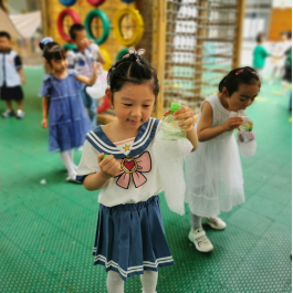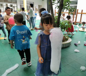 孩子们先将纱布蒙在水瓶一端,扎上皮筋固定。接着,用泡泡水沾湿纱布,再用不同颜色的色素滴在纱布上,最后从水瓶另一端用力吹啊吹,彩色的泡泡龙就出现了!随着实验的进行,孩子们还想出了不同的玩法,有的孩子将色素滴在泡泡水中,还利用混色的原理混合出不一样的颜色;有的孩子的水瓶细细的,能够用力吹出长长的泡泡龙;有的孩子直接在泡泡水中吹,发现吹出的泡泡像花一样……