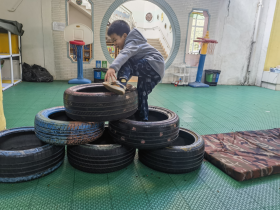 孩子们有的将轮胎堆成小山的形状,手脚并用攀爬轮胎小山;有的将轮胎间隔摆放,在平放的轮胎上竖立摆放其他轮胎,开始玩起了钻爬游戏……废旧的轮胎,在成人眼中用处不大,可在孩子们眼中是最好的“玩伴”。不断创新的玩法让“废旧轮胎”已完全超越了它们原有的、单一的功能,见证着孩子们在自主游戏过程中的每一步变化与发展。