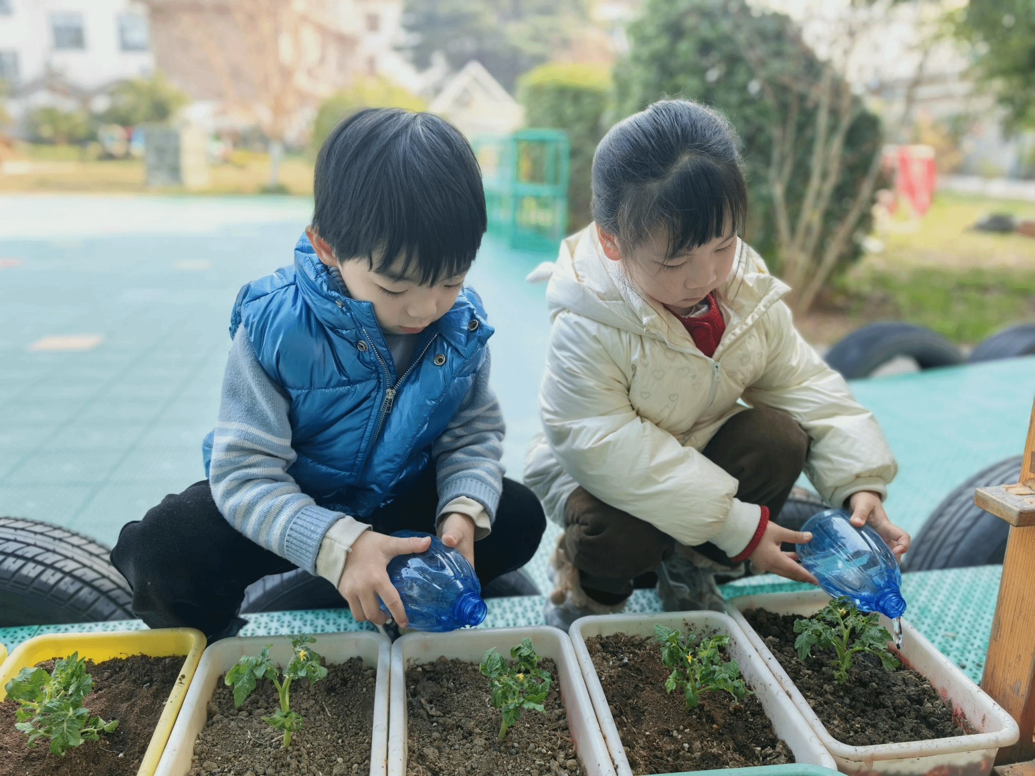 《纲要》中指出:幼儿学习科学活动的过程中,老师要让幼儿运用感官,亲自动手、动脑去发现、解决问题。他们通过看、闻等多感官方式进行探索,利用现有的实物材料进一步地了解了番茄。孩子们通过讨论得出种植前需要准备泥土,还有喷壶,可以给番茄浇水;还需要铲子,可以铲土;还要有番茄的种子。为了更快地看到番茄的成长过程,我们选择了栽种番茄苗,孩子们栽下小苗,每天早晨孩子们一进入教室,迫不及待地就要去看看番茄苗长高了没有,还会主动给番茄浇水。在每天的照顾中,幼儿对观察番茄生长的变化充满好奇。