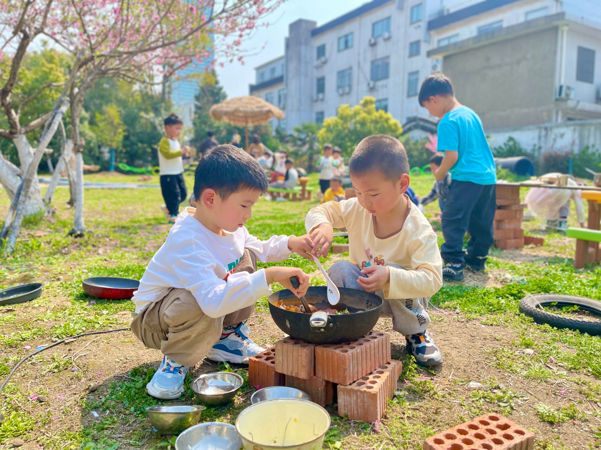 孩子们在地上拔几根草煮煮汤、泡泡茶,捡一些树叶在砖块上炒炒菜、做做烧烤等,充分地与大自然接触,利用身边的资源和材料进行游戏。他们在活动中不仅学会分享,体验合作的乐趣,同时更能懂得尊重别人的劳动成果。