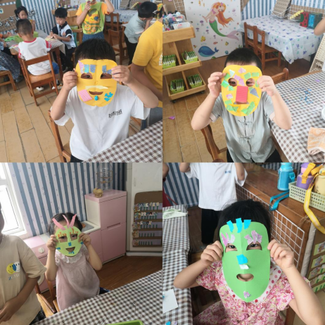 三角形、正方形、圆形、椭圆形、长方形的面具底板。红颜色、黄颜色、蓝颜色、紫颜色......亮光纸、卡纸、瓦楞纸、皱纹纸......,各种颜色的纸。孩子们根据自己的需要有目的地进行选用。这些纸在孩子们的手中撕一撕、揉一揉、卷一卷、贴一贴,一个个有趣的,夸张的面具就做好了。孩子们互相欣赏自己的创作,体验创造、成功的快乐。