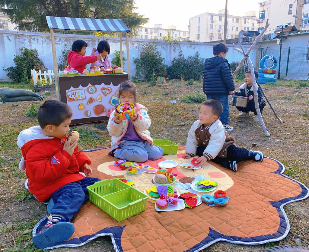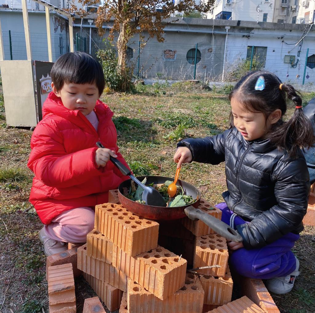 为了让幼儿在游戏中获得学习的经验,进一步成为游戏的主人,提高游戏的自主性。中二班的小朋友把娃娃家搬到了户外,充分利用大自然的一草一木、一砖一瓦,建构出“野外娃娃家”这一独特的游戏形式。