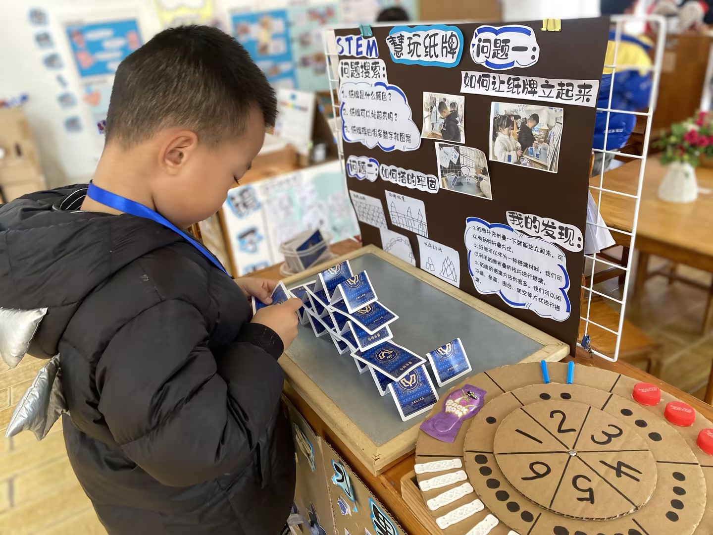 例如在益智区的创设上通过投放多元的游戏材料,开设了“雪花配对、找影子、数物匹配”等益智游戏,增强了幼儿对数字对应、数量的认知,通过观察与发现,实际操作、尝试解决日常生活中需要用到的数学问题,体会数学的用处。在此区域我们也融合了STEM理念,在益智区发现孩子们在玩纸牌材料时,有了新的创新。纸牌除了可以比大小之外,关于纸牌,孩子们还想知道,纸牌可以站起来吗?于是我们以孩子在探究中的问题、兴趣为切入点,在益智区开启慧玩纸牌的STEM活动。