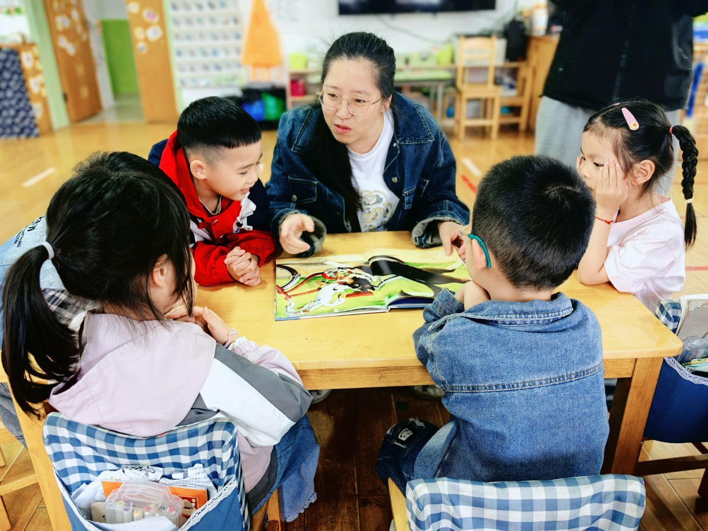讲故事过程中,妈妈们不断与孩子们互动交流。“小朋友们猜猜,接下来会发生什么呢?谁能模仿一下小鸭子骑车的样子呀?” 孩子们纷纷踊跃举手,大胆分享自己的想法,现场气氛热烈非凡。他们完全沉浸在故事里,时而因紧张情节皱起小眉头,时而被有趣内容逗得哈哈大笑,眼中满是对知识的好奇与渴望。妈妈们温柔地陪伴在孩子们身旁,和他们一起享受阅读的美好时光。
