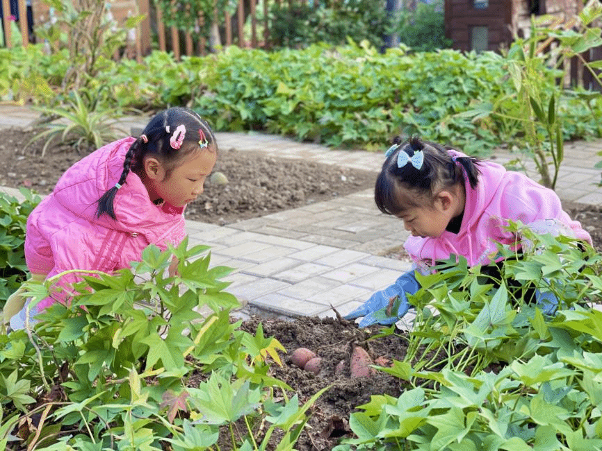 孩子们戴好小手套,拿起小铲子、小耙子,兴奋地投入种植地。有的顺着红薯藤的根部小心翼翼地拨开泥土,有的合力撬动泥土中的红薯,还有的蹲在地上观察红薯的形状。当一个个圆滚滚、红扑扑的红薯被挖出来时,孩子们欢呼雀跃,纷纷展示自己的“战果”。“老师,我挖了一个超大的红薯!”“你看,我的红薯像小皮球!”种植地里满是欢声笑语。