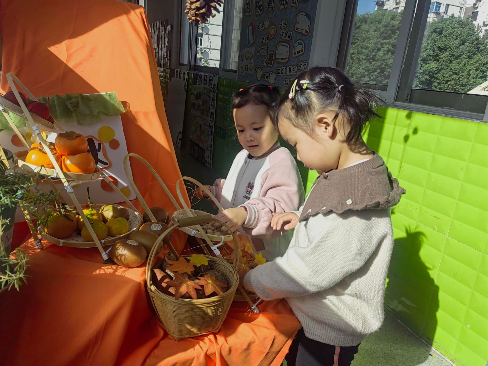 活动从“认水果”开始,老师把装满秋日水果的篮子搬进教室:金黄的橘子、红彤彤的苹果、圆滚滚的柿子、带着绒毛的猕猴桃整齐摆放,瞬间吸引了孩子们的目光。“这个橘子皮摸起来滑滑的!”“苹果闻着好香呀!”活动中,孩子们围坐在桌边,你一言我一语,伸出小手轻轻触摸果皮,凑近鼻尖感受果香,在老师的引导下说出水果的名字和颜色,还知道了“橘子剥了皮才能吃”“柿子熟了会变软”的小知识。活动最后,老师还把水果投放到班级自然角,不少宝贝还会拉着老师的手,指着晒架上的水果问:“什么时候能吃呀?”稚嫩的提问里满是对秋日甜蜜的期待。