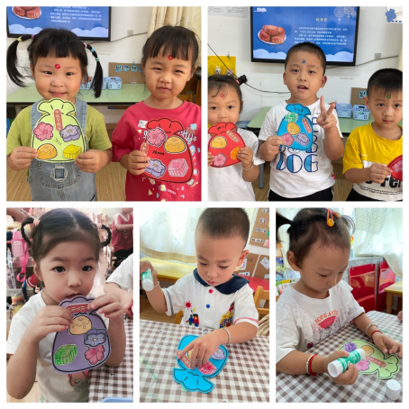 活动中,因是刚进入小班的孩子,动手能力相对很弱,孩子们在老师的帮助下完成了涂色、剪贴,作品完成后孩子们个个都开心地说要把“月饼礼盒”给爸爸妈妈呢。