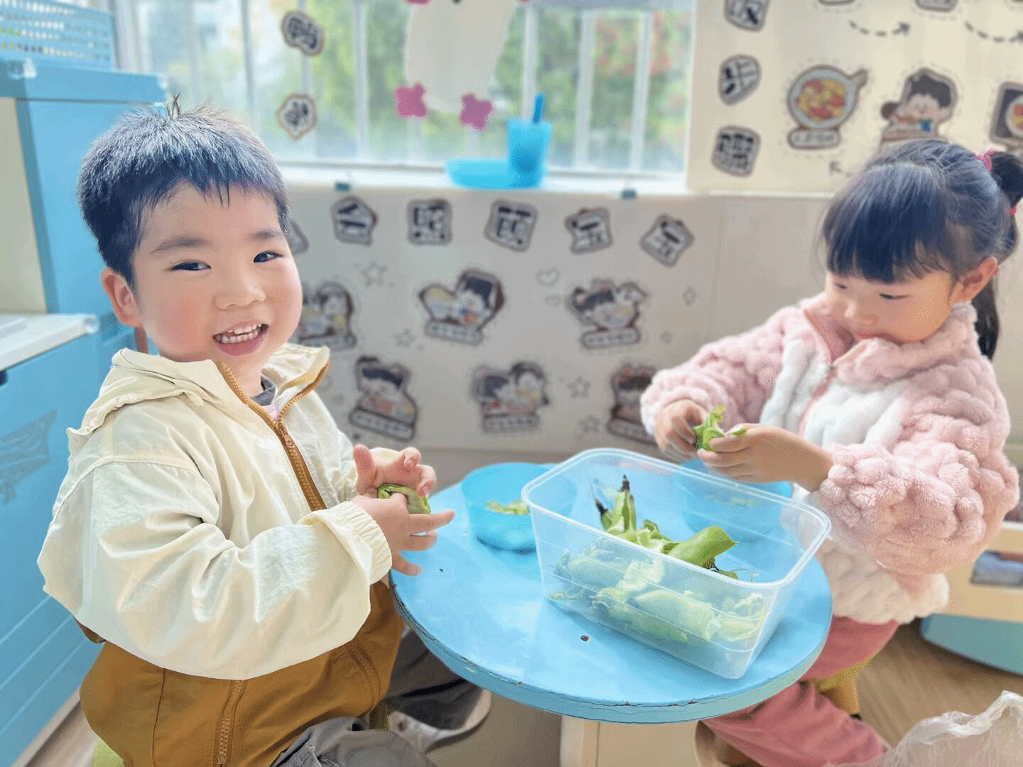一开始,不少孩子手忙脚乱,豆子在手中调皮地滚来滚去。有的孩子力气用得不对,豆子没剥开,反倒撒了一地。但在老师的耐心指导下,孩子们逐渐掌握了技巧,小手变得灵活起来。他们专注地剥开豆荚,将一颗颗饱满的豆子放进碗里,脸上洋溢着成功的喜悦。