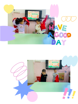 我们一起编了一首儿歌:抓领子,钻洞子;左钻钻,有钻钻;吱吱吱,上房子;拉好盖上小肚子。当孩子们再次穿衣服时,有了明显的进步,并且慢慢摸索总结出了一些自己的方法,别看萌宝们小小的身体,却有着大大的能量呢!